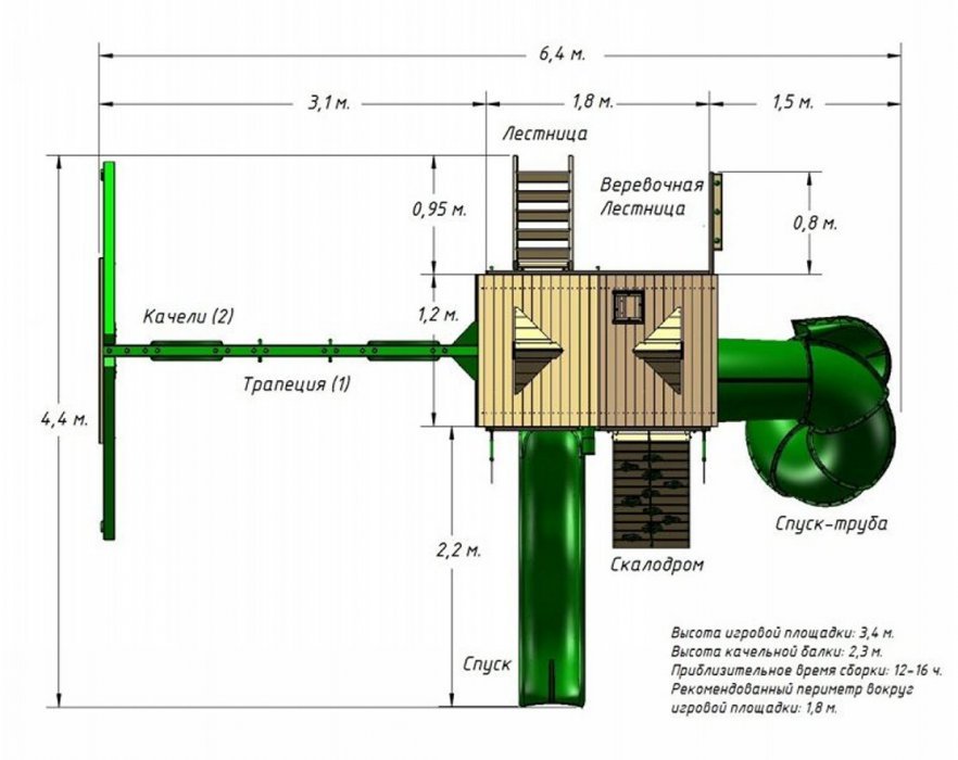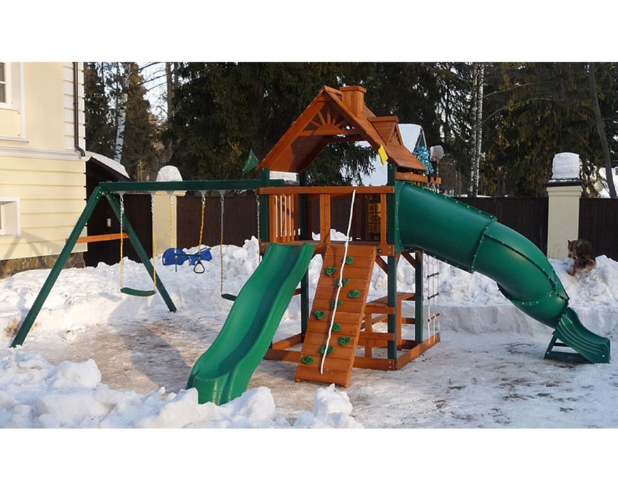Большая детская игровая площадка Царь горы с двумя спусками и фортом под деревянной крышей с окошками и трубой. Царь горы — игровой комплекс, рассчитанный на детей в возрасте от 3 до 12 лет. Эта двухуровневая и многофункциональная площадка будет отлично смотреться как на загородном участке, так и во дворе жилого дома, детского сада или школы, в сквере или парке. Благодаря продуманной конструкции и сочетанию в одном комплексе всех видов игрового оборудования, площадка может использоваться для организации одновременного отдыха целой группы малышей разного возраста.