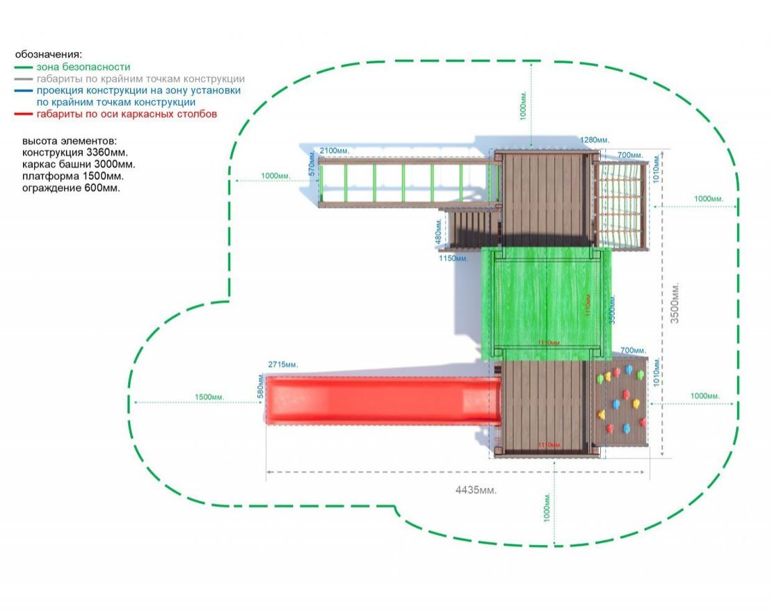 Для безопасной эксплуатации конструкции, площадка должна быть свободна от зеленых насаждений, сооружений и других конструкций, ровная, без перепадов уровня, без впадин и насыпей. Габариты площадки с учетом зоны безопасности длина 7435мм. ширина 6500мм., площадь площадки S-48,3м². Запрещено устанавливать конструкцию в зонах с повышенным риском провалов в грунте (болотистая местность, береговая линия водоемов, в непосредственной близости с оврагами и обрывами). Типы оснований: естественный грунт средней плотности и выше (Pd≥1,2г/см³), готовое асфальтобетонное основание, газон с дренажным основанием. Поверхность основания по крайним точкам конструкции длина 4435мм., ширина 3500мм., должна быть выровнена по горизонту, допустимый уклон поверхности 20мм на 10 погонных метров. Все элементы конструкции соприкасающиеся с поверхностью основания конструкции должны быть в единой плоскости. Данная модель не требует бетонирования, отдельные элементы конструкции необходимо зафиксировать арматурными анкерами.