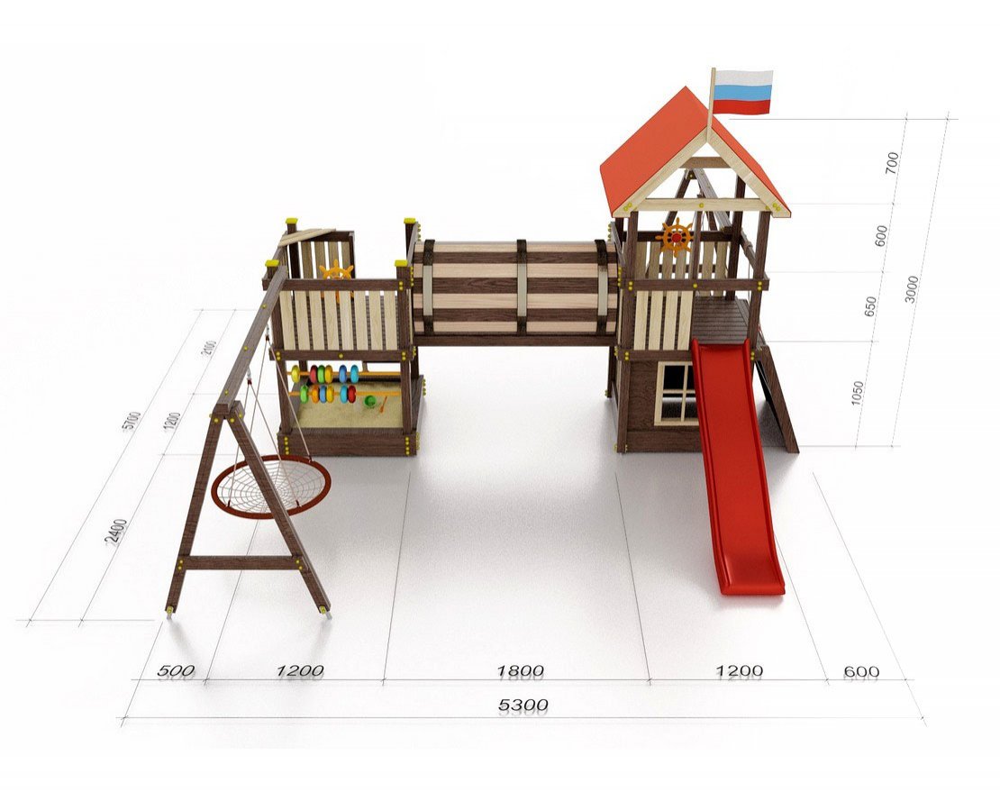 Для максимальной защиты ребёнка от травм, все углы имеют закруглённую форму, крепеж скрыт пластиковыми заглушками. Опоры изготовлены из клеёного бруса толщиной 90*90 мм.