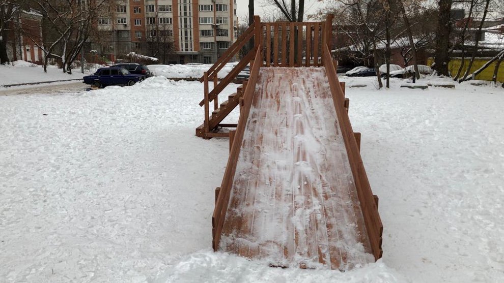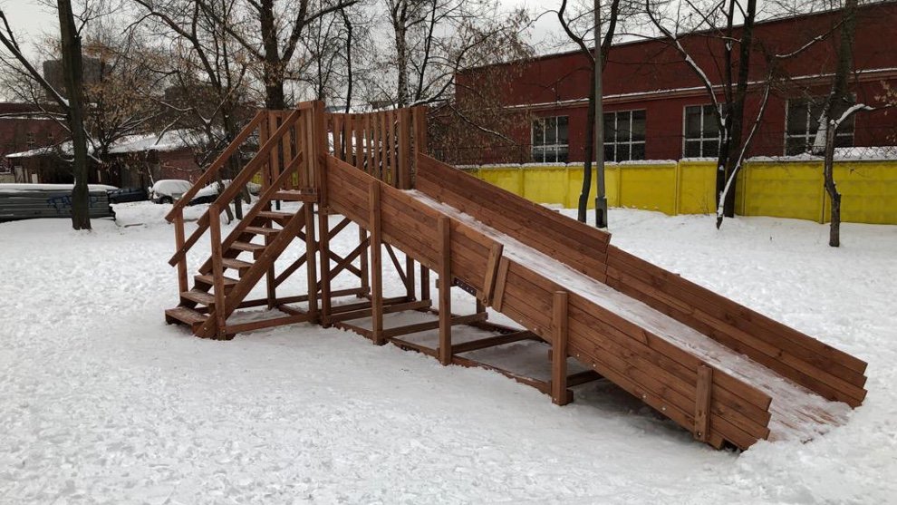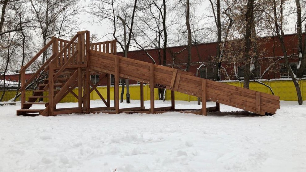 Благодаря болтовым соединениям ледяная горка легко разбирается сразу после того, как растает снег и не занимает место на участке. Древесина пропитана специальным составом, поэтому горка не испортится, даже если её залить водой в мороз и превратить в ледяную.