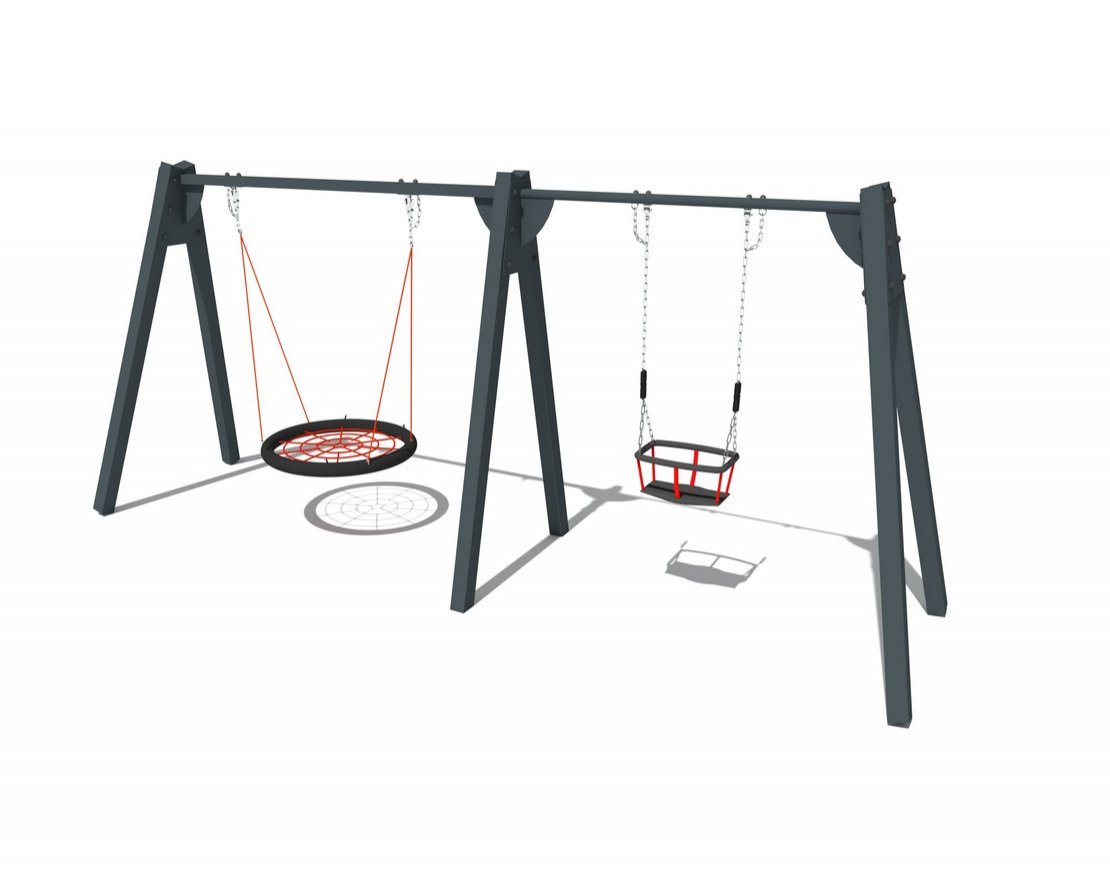 Двойные качели на металлических стойках. Устанавливаются путём бетонирования. Одно из сидений люлька, другое – типа «гнездо».