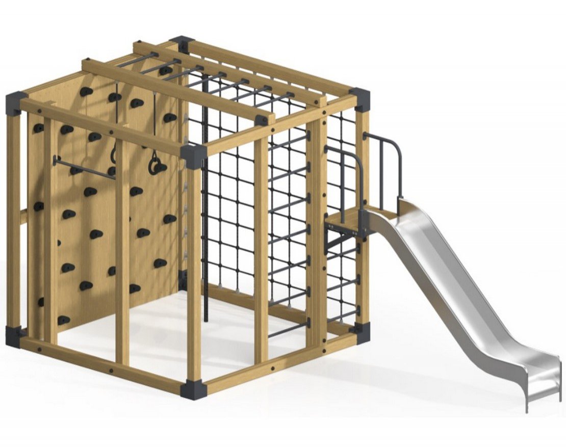 • Особенности комплектации: канат, гимнастические кольца, турник, рукоход, гладиаторская сетка, горка, скалодром