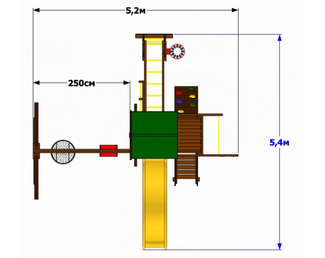 - Спортивной составляющей уделено большое внимание. Конструкция оборудована шведской стенкой, гимнастическими кольцами, баскетбольным кольцом с сеткой, а также модулями «Турник» и «Рукоход».