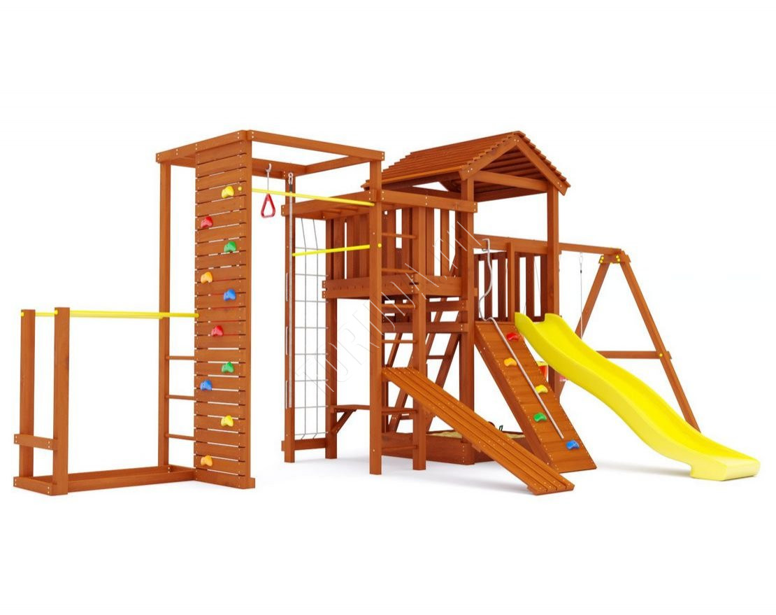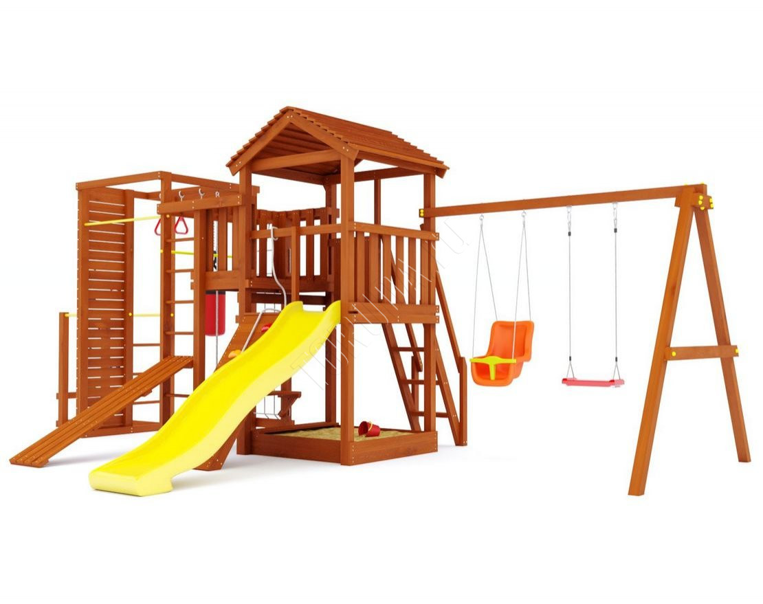 Высокая прочность конструкции и использование материалов высокого качества делают этот комплекс очень долговечным и безопасным. Вся древесина проходит качественную обработку и имеет сертификат безопасности. Металлические детали комплекса усилены, а качельный подвес из оцинкованной стали не будет ржаветь во время эксплуатации. Установленные не снимаемые пластиковые заглушки делают комплекс безопасным и аккуратным внешне.