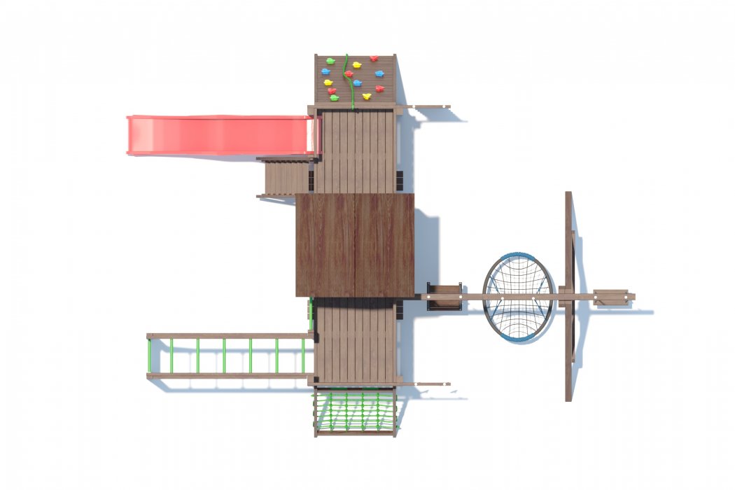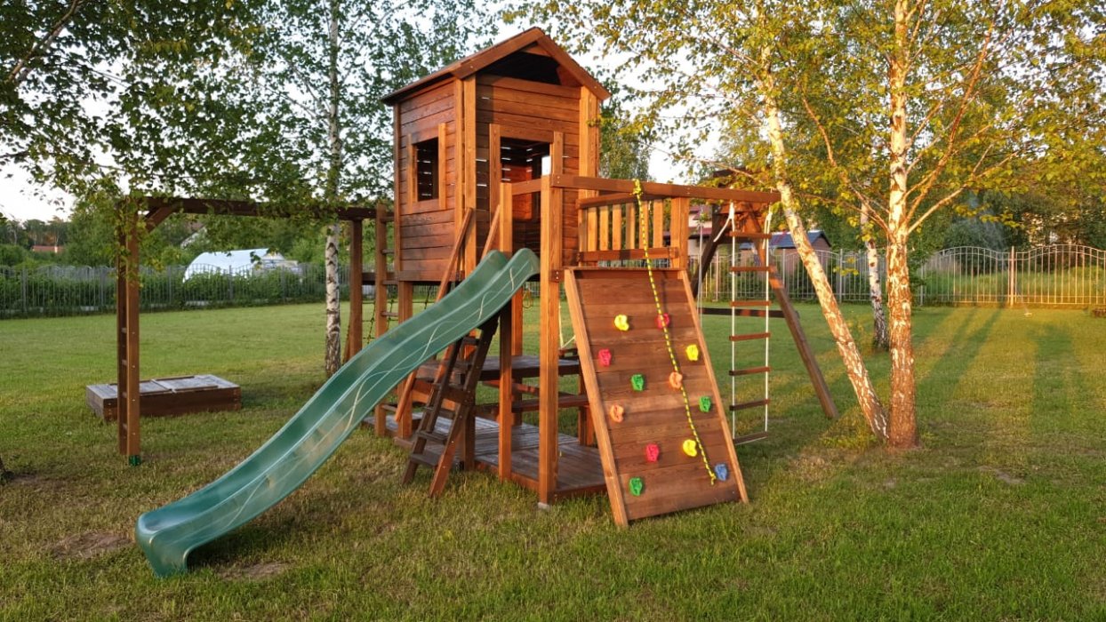 Основа детской игровой - спортивной конструкции - башня с террасой и игровой платформой. Конструкция оснащена двускатной деревянной крышей, встроенным домиком в верхней части конструкции, встроенным столиком с лавками в нижней части конструкции, дополнительной платформой в основании конструкции, пластиковым волнообразным скатом с превосходной скользящей поверхностью, деревянной лестницей, широким скалодромом, канатной лестницей, деревянным рукоходом, шведской стенкой, приставными качелями, сидением качели «гнездо», сидением качели «малютка», гимнастическими кольцами, подвесной лестницей. Для безопасности ребенка предусмотрены перила на лестнице, заборчики и ограждения над зонами препятствий (скалодром, канатная лестница, скат).