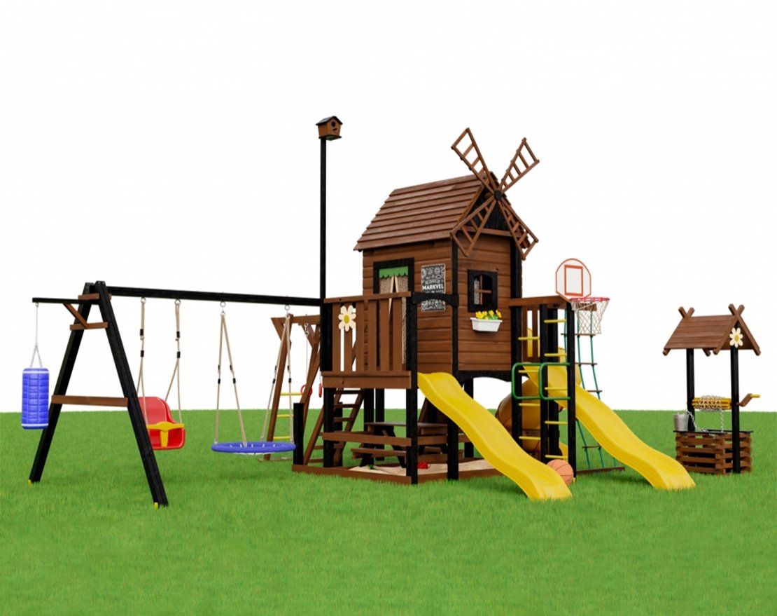 Игровой комплекс Мулен 6 с колодцем — это уютный деревянный домик, наполненный атмосферой приключений. Его узнаваемый силуэт с декоративными лопастями на крыше перенесет детей в мир сказок, где можно представить себя отважным путешественником, хозяином мельницы или капитаном воздушного корабля. Площадка сочетает различные игровые и спортивные элементы, помогая ребенку развивать ловкость, силу и координацию. Лестницы, канаты, качели и горка превращают игру в увлекательное приключение, в котором важно не только фантазировать, но и двигаться. Внутри домика продумано всё до мелочей — каждый уголок наполнен возможностями для игры, творчества и удобства. На втором этаже маленьких художников ждет доска для рисования, где можно воплощать свои фантазии. Два отдельных столика со стульчиками позволяют детям играть, рисовать или устраивать чаепитие, не мешая друг другу. А просторная песочница под домиком станет местом для совместных экспериментов с песочными замками — здесь хватит места всем! Два раздельных входа делают пространство более просторным и удобным, создавая еще больше возможностей для веселой и динамичной игры.