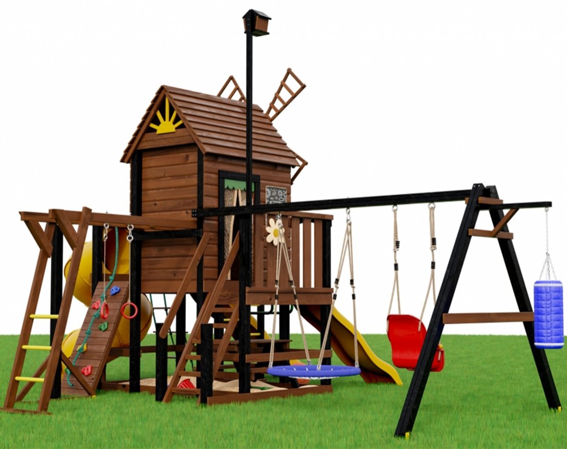 Игровой комплекс Мулен 6 — это уютный деревянный домик, наполненный атмосферой приключений. Его узнаваемый силуэт с декоративными лопастями на крыше перенесет детей в мир сказок, где можно представить себя отважным путешественником, хозяином мельницы или капитаном воздушного корабля. Площадка сочетает различные игровые и спортивные элементы, помогая ребенку развивать ловкость, силу и координацию. Лестницы, канаты, качели и горка превращают игру в увлекательное приключение, в котором важно не только фантазировать, но и двигаться. Внутри домика продумано всё до мелочей — каждый уголок наполнен возможностями для игры, творчества и удобства. На втором этаже маленьких художников ждет доска для рисования, где можно воплощать свои фантазии. Два отдельных столика со стульчиками позволяют детям играть, рисовать или устраивать чаепитие, не мешая друг другу. А просторная песочница под домиком станет местом для совместных экспериментов с песочными замками — здесь хватит места всем! Два раздельных входа делают пространство более просторным и удобным, создавая еще больше возможностей для веселой и динамичной игры.