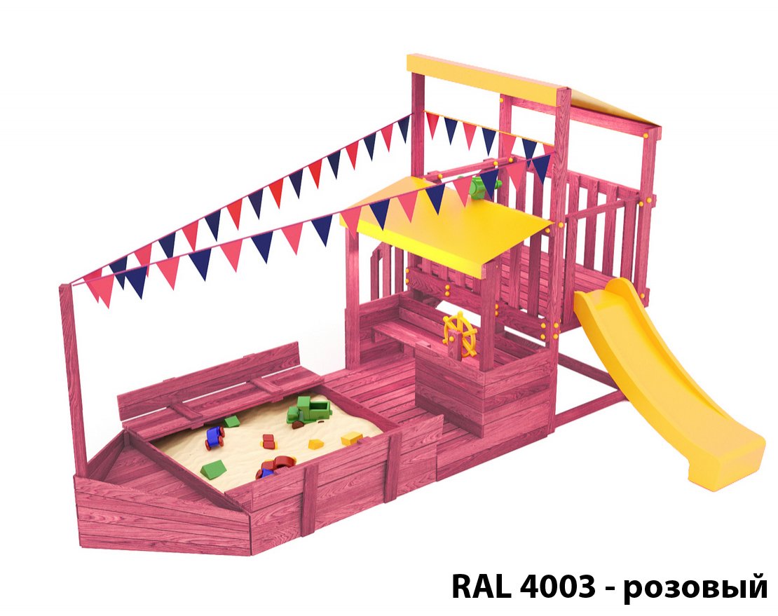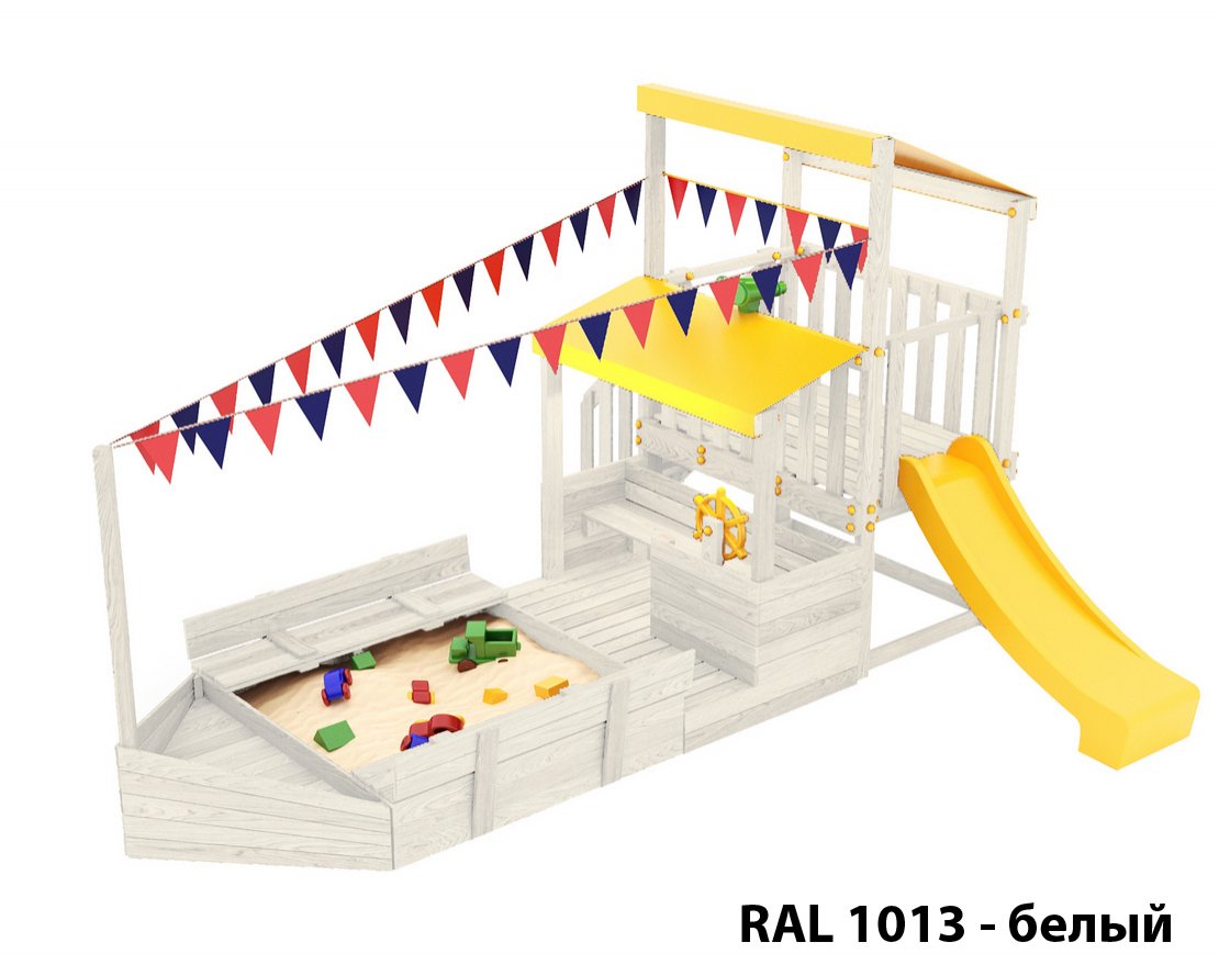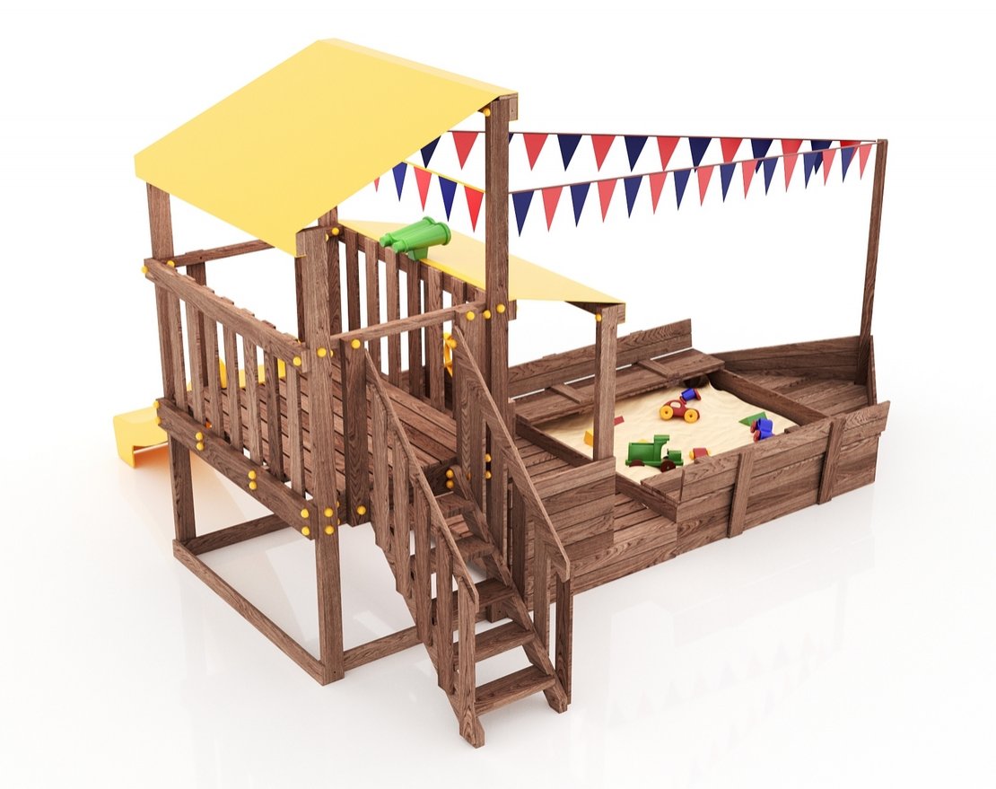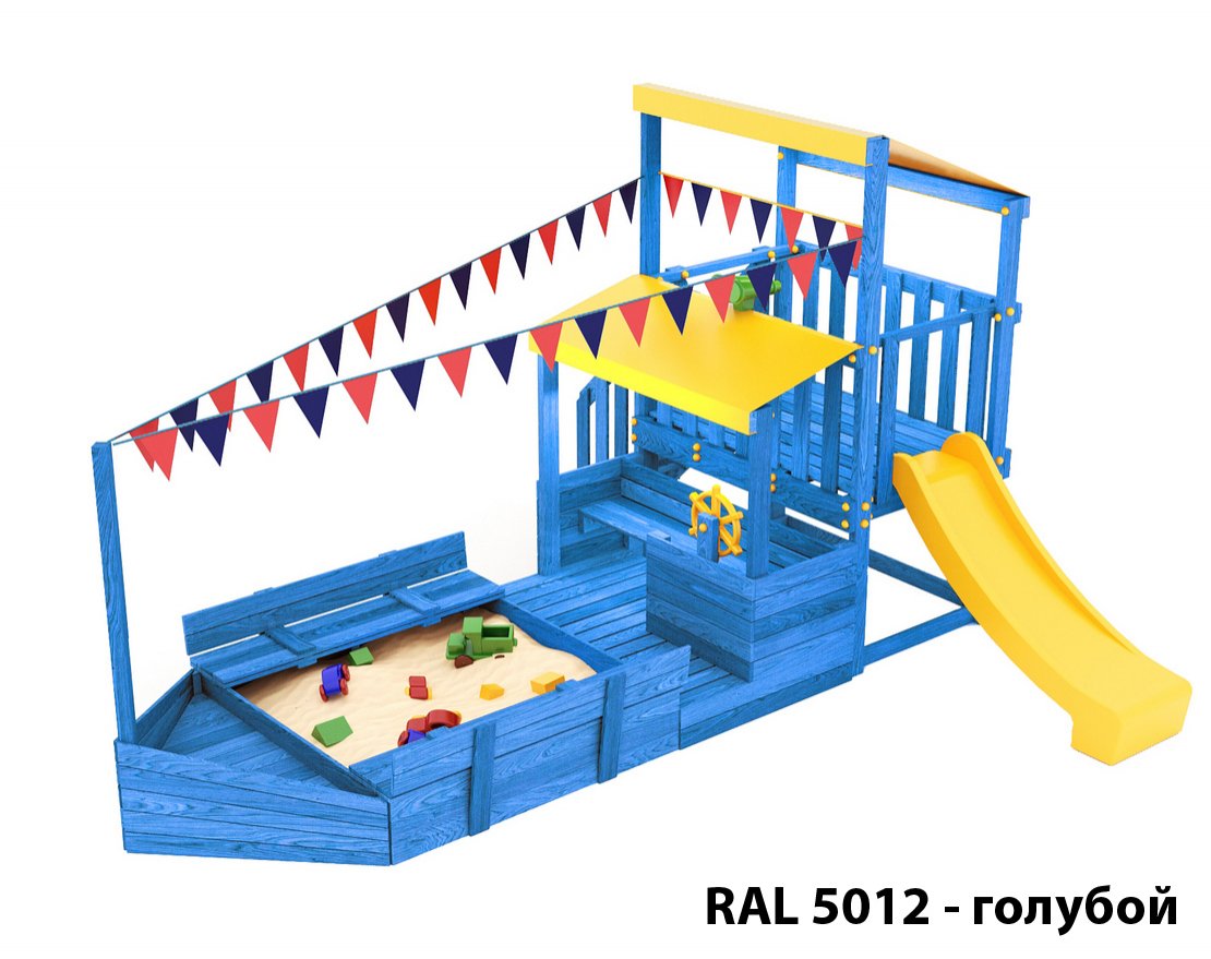 Детская песочница с крышками-лавочками и кораблик, включающий в себя штурманскую рубку и капитанский мостик с горкой с высоты 900 мм с флажками, а также две крыши закрытые тентом, чтобы можно было отправиться в дальнее плавание даже под дождем.