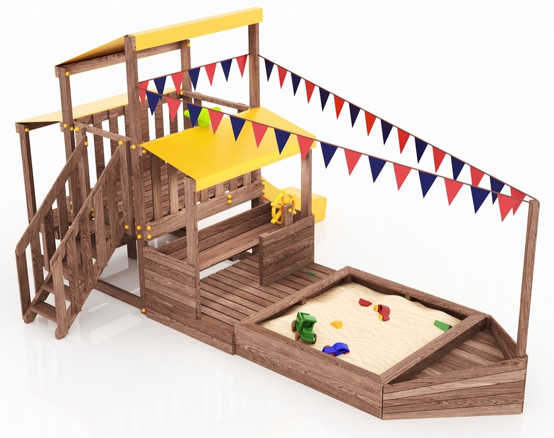 Детская песочница-кораблик, включающая в себя штурманскую рубку и капитанский мостик с горкой с высоты 900 мм с флажками.