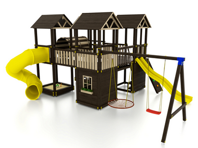 Для максимальной защиты ребёнка от травм, все углы имеют закруглённую форму, крепеж скрыт пластиковыми заглушками. Опоры изготовлены из клеёного бруса толщиной 90*90 мм.