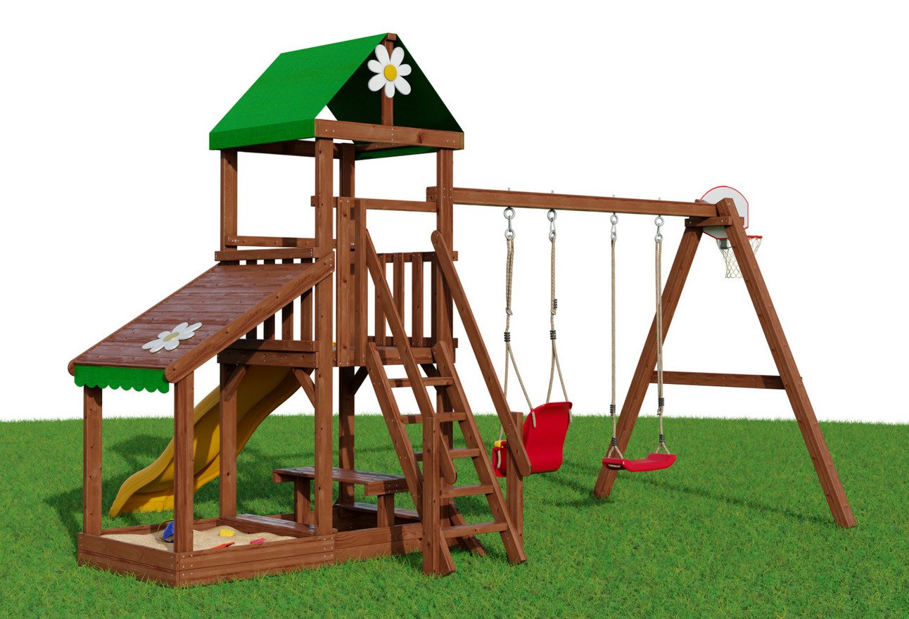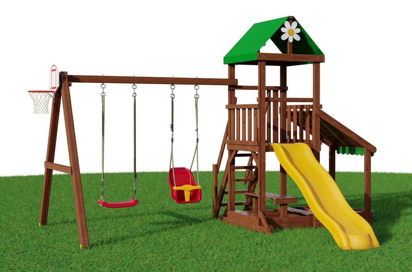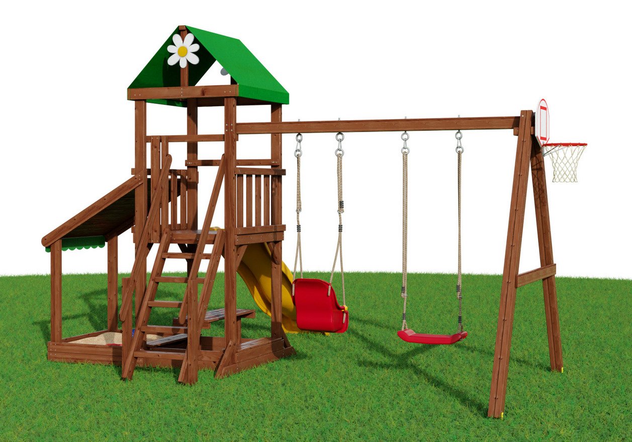 Самые маленькие будут рады удобным и безопасным качелям с высокими бортиками. Рядом – модель для ребят постарше. Шумной компанией весело кататься с горки или играть в баскетбол. В пространстве под горкой расположен столик и скамейки, а рядом – песочница, защищенная от дождя и солнца крышей.