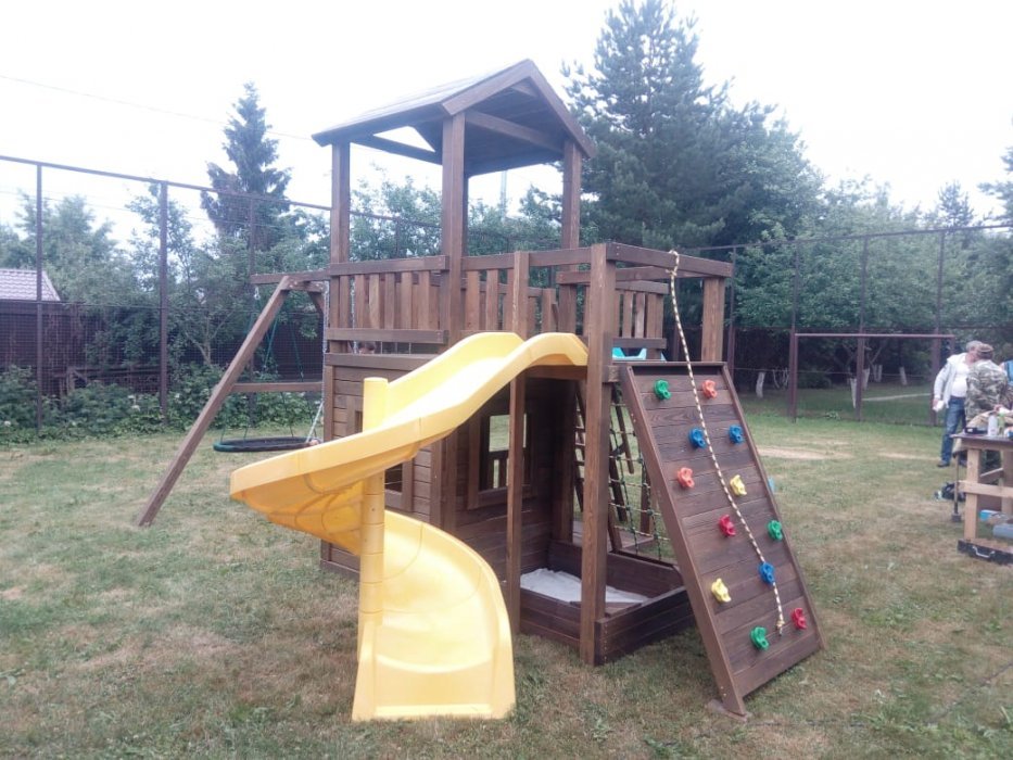 Основа детской игровой - спортивной конструкции - башня с террасой и игровой платформой. Конструкция оснащена двускатной деревянной крышей, встроенным домиком в верхней части конструкции, встроенной песочницей с крышкой «трансформер» в нижней части конструкции, дополнительной платформой в основании конструкции, пластиковым волнообразным скатом и винтовым скатом с превосходной скользящей поверхностью, деревянной лестницей, широким скалодромом, канатной лестницей, деревянным рукоходом, шведской стенкой, приставными качелями, сидением качели «гнездо», сидением качели «малютка», гимнастическими кольцами, подвесной лестницей. Для безопасности ребенка предусмотрены перила на лестнице, заборчики и ограждения над зонами препятствий (скалодром, канатная лестница, скат).