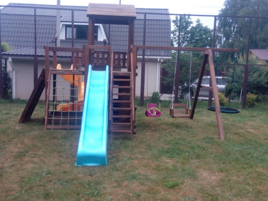 Каждая деревянная деталь детской игровой - спортивной конструкции состоит из древесины сибирской лиственницы: клееный и сращенный брус лиственницы сечением 90х90мм.; клееный и сращенный брус лиственницы сечением 80х40мм., доска – планкен из лиственницы сечением 90х20мм. (камерная сушка, влажность 8-16%). Каждая деревянная деталь обработана безопасным для детей покрытием в два слоя – маслом для террасной доски и восковой лазурью «ADLER» цвет «орех», со стороны торцов дополнительно запечатана мастикой. При желании, вы сможете самостоятельно обновлять покрытие деревянных элементов конструкции (при естественном износе покрытия один раз в 2-3 года) или проводить реставрацию отдельных конструктивных элементов (при механическом повреждении), главное подобрать по цвету масло для террасной доски, предназначенное для эксплуатации на улице.