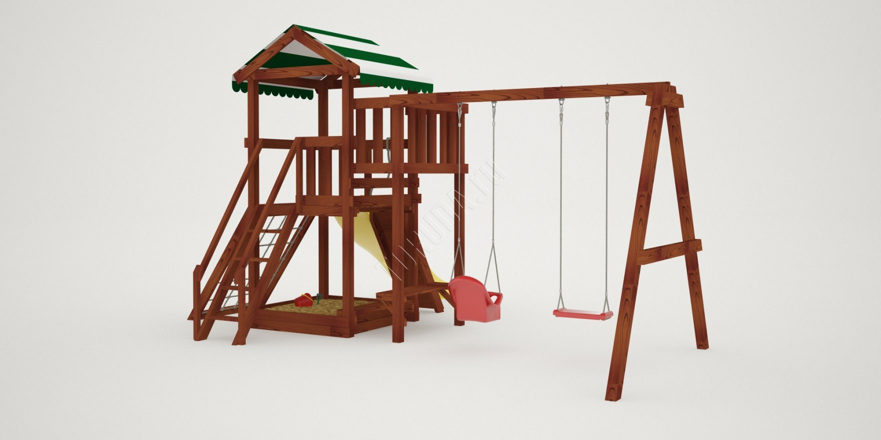 Сбоку к башне крепится качельная рама для двух элементов на выбор, например, качели «Лодочка» и «Люкс» со спинкой. Они очень нравятся как маленьким деткам, так и младшим школьникам.