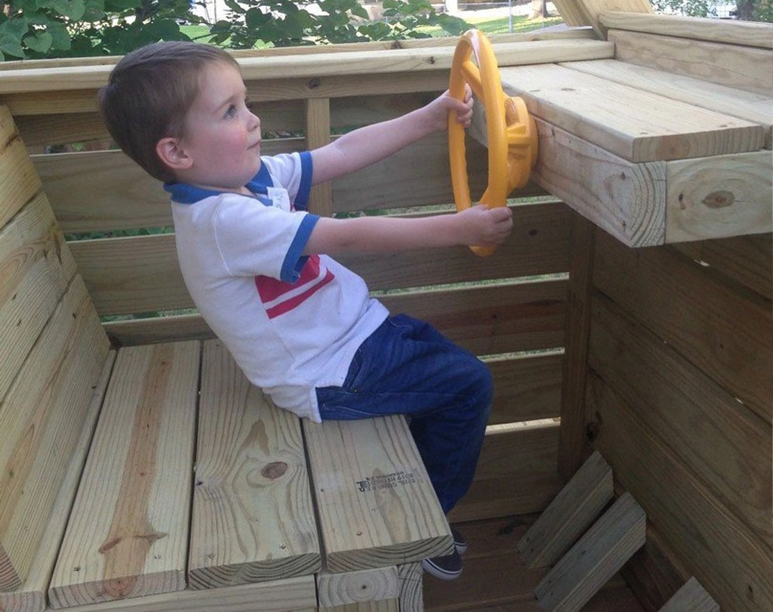 Множество мелких деталей добавляют реализма и радости, которую дети могут получить от этого дизайна. Моторный отсек открыт, чтобы дети могли залезть туда и поиграть. Монстр Трак включает в себя люк, место для горки высотой 183 см, сиденья, педали и другие детали.