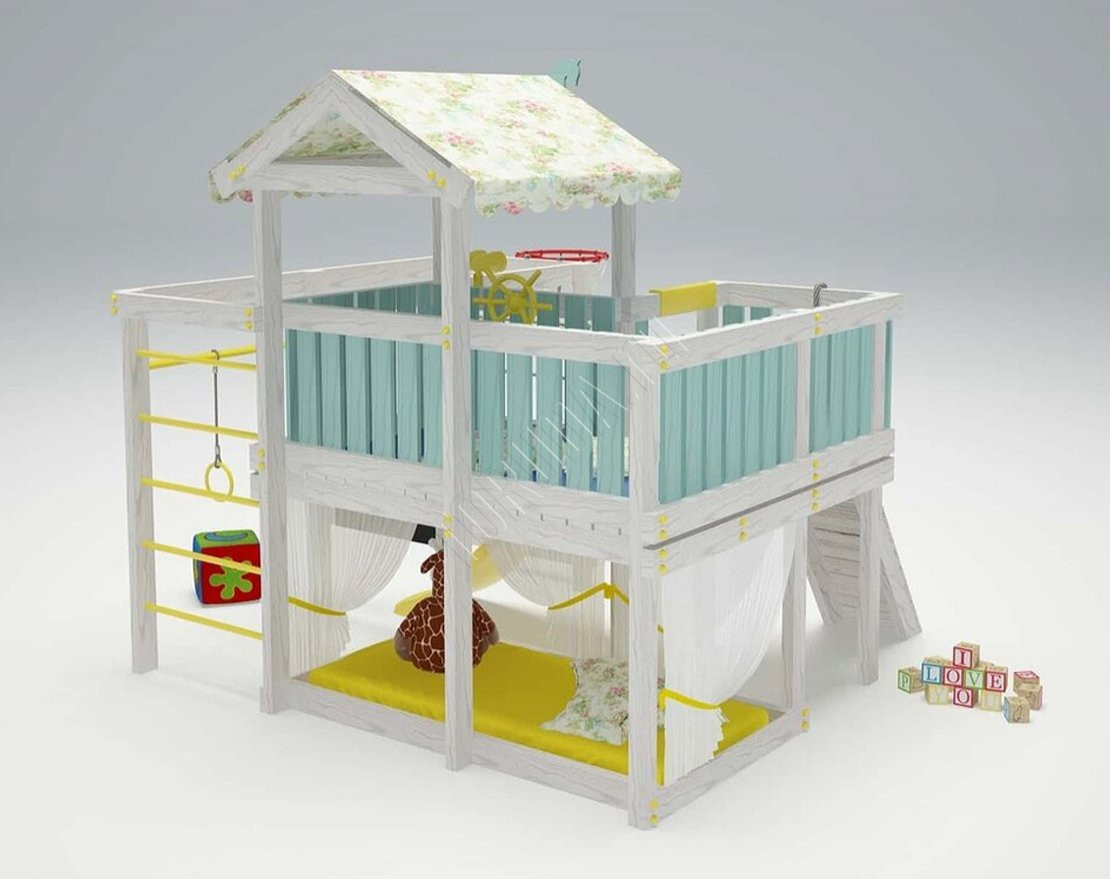 - Второй ярус легко оборудовать под кровать, если докупить матрас и подушки. Под платформой можно организовать уютный приватный уголок для спокойных игр. Его также можно использовать как спальное место для второго ребёнка.