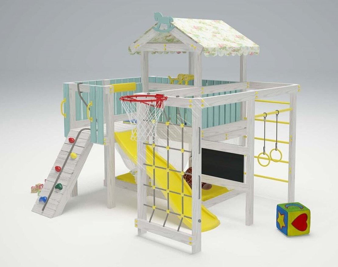 - Рядом с башней расположили спортплощадку. Она понравится активным малышам. Шведская стенка и удобная сетка-лазалка с крупными ячейками подходят для тренировки силы и ловкости. На гимнастических кольцах и турнике малыш быстро разовьёт мышечную силу и сформирует правильную осанку.