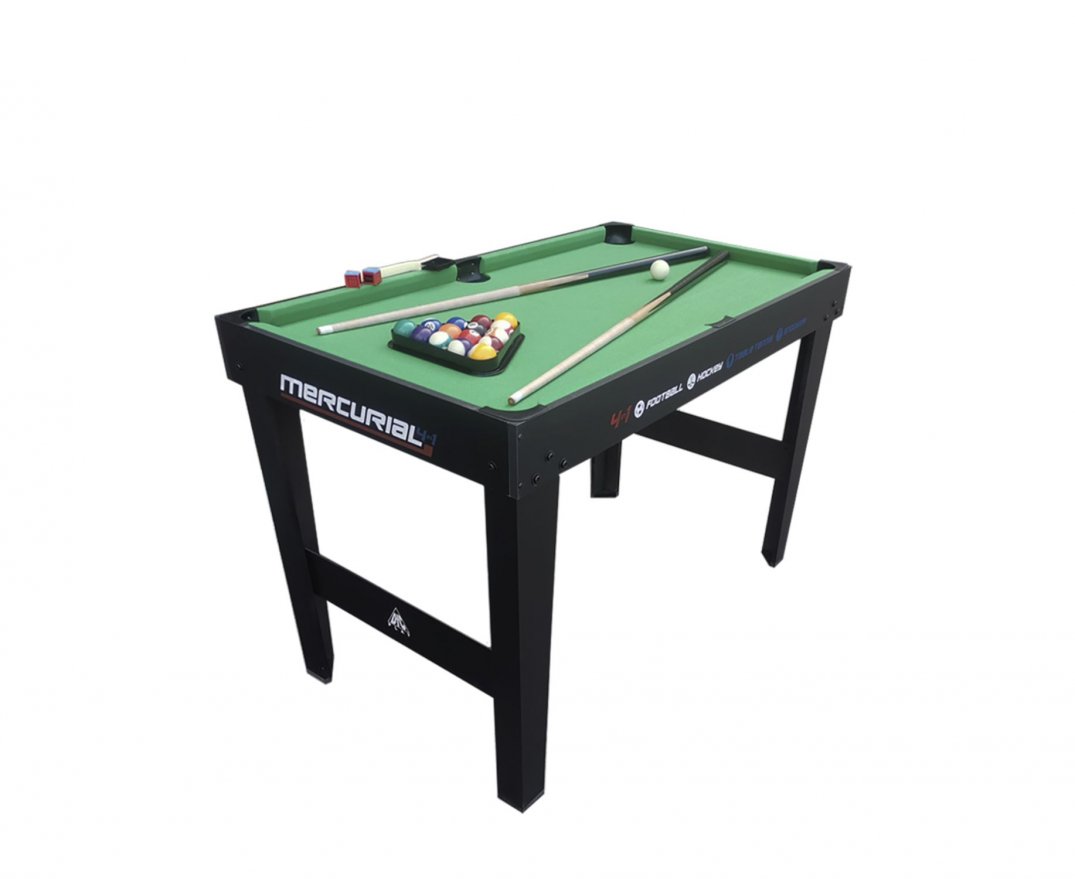 Многофункциональный игровой стол MERCURIAL 4ft — то, что нужно для большой компании! Играйте в футбол, бильярд, настольный теннис и аэрохоккей на одном столе, легко меняя игровые поля. Яркое оформление и стильный дизайн сделают игру ещё более увлекательной.