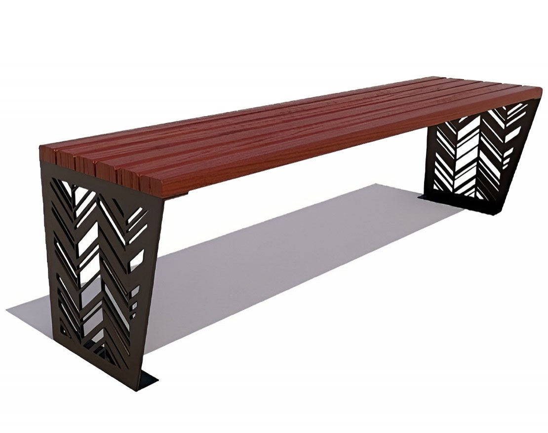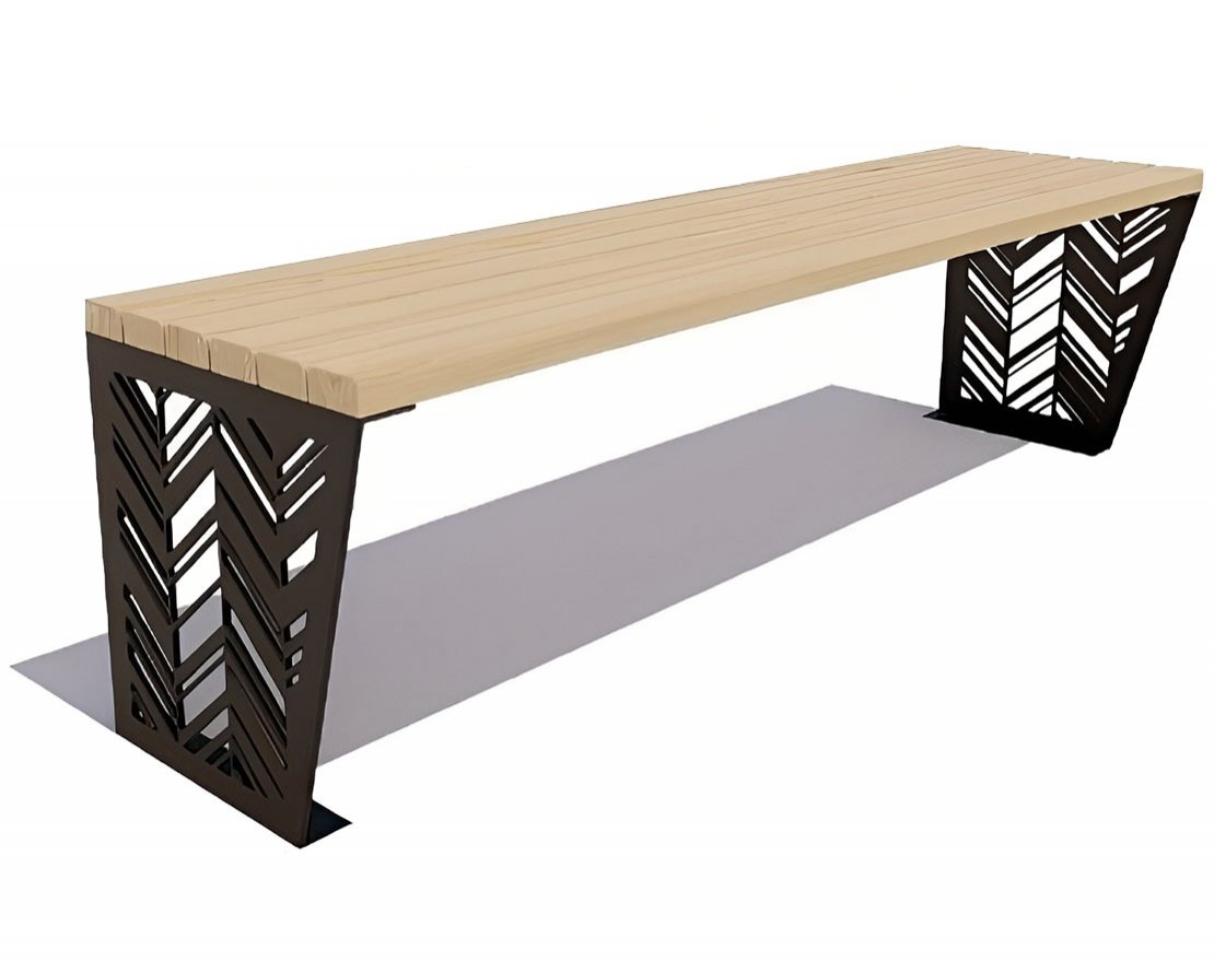 Простая, но прочная банкетка «Гарнизон» без спинки, сделанная на стальном каркасе, имеет геометрический орнамент на боковинах. Сидение выполнено из ангарской сосны. Размеры идеально подходят для небольших улиц и дачных участков.