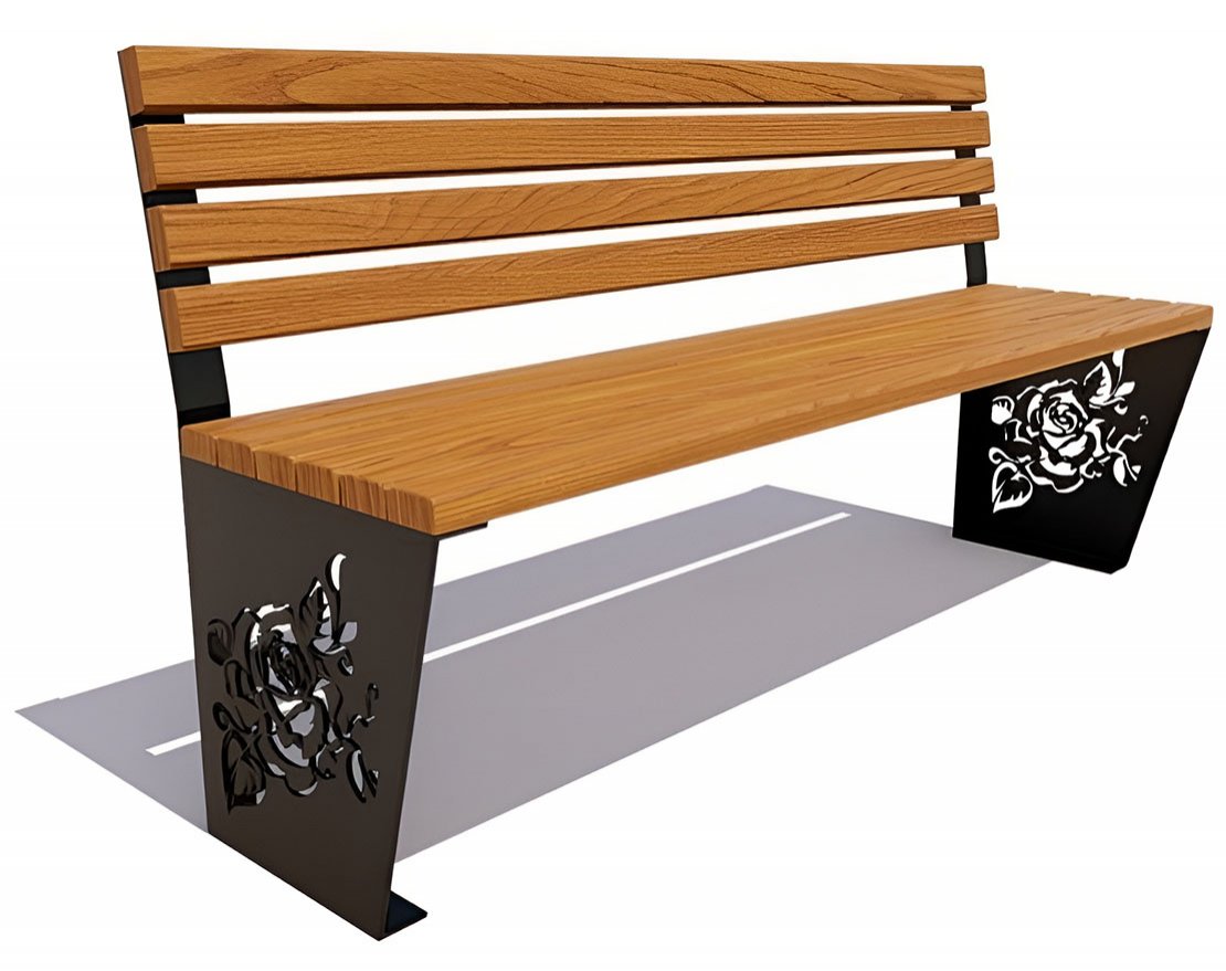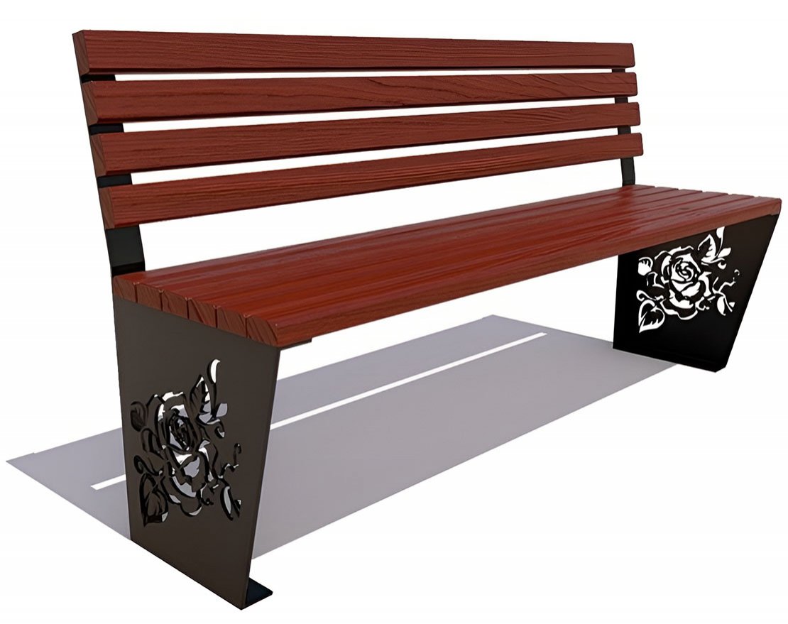 Красивая скамейка «Роза» без подлокотников — идеальное украшение дачного участка или парка и сквера. Каркас ее сделан из листовой стали, боковины украшены рисунком, выполненным лазером, в виде распустившейся розы. Сидения из ангарской сосны или лиственницы окрашиваются в 5 цветов по каталогу RAL.