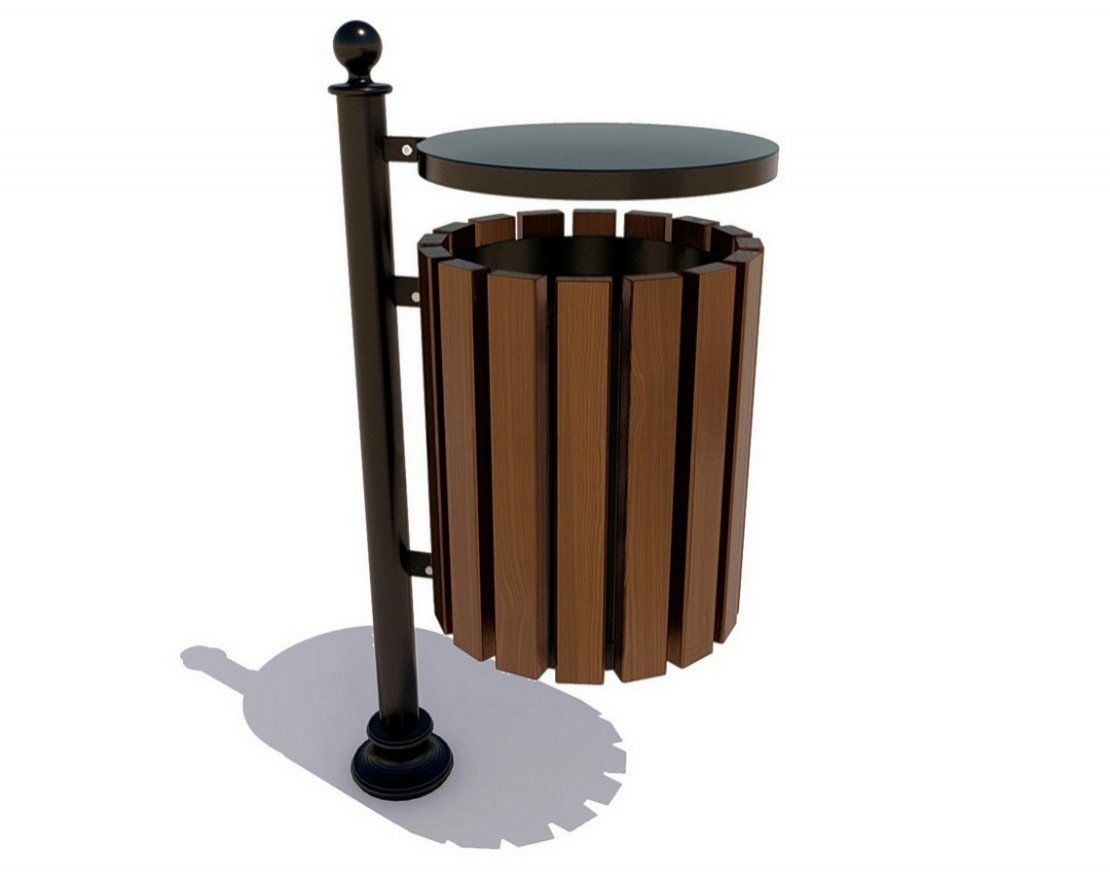 Чугунный каркас урны «Арчи» — прочный и долговечный. Отделка вертикальными сосновыми рейками придает урне эстетичный вид, крышка защищает от наполнения водой или снегом в непогоду.